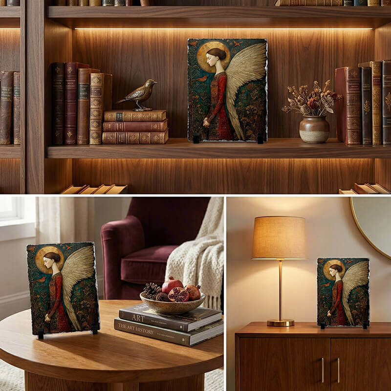Το θέμα, μια αιθέρια μορφή αγγέλου με περίτεχνο χρυσό φωτοστέφανο και εντυπωσιακό ένδυμα σε βαθύ κόκκινο, έχει αποτυπωθεί απευθείας πάνω σε φυσικό πέτρωμα σχιστόλιθου. Η ακανόνιστη υφή στις άκρες του πετρώματος λειτουργεί ως ένα φυσικό κάδρο, μετατρέποντας την εκτύπωση σε ένα μοναδικό έργο τέχνης με vintage αισθητική.