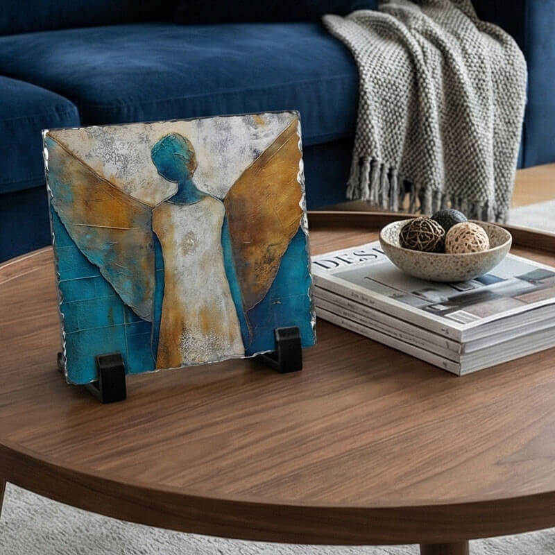 Η σύνθεση ξεχωρίζει για τον αφαιρετικό της χαρακτήρα, συνδυάζοντας το έντονο τυρκουάζ φόντο με τις γήινες, χρυσές αποχρώσεις στα φτερά της αγγελικής μορφής. Το θέμα έχει αποτυπωθεί απευθείας πάνω σε φυσικό πέτρωμα σχιστόλιθου, με την ακανόνιστη υφή στις άκρες να αναδεικνύει τον μοναδικό χαρακτήρα του πετρώματος.