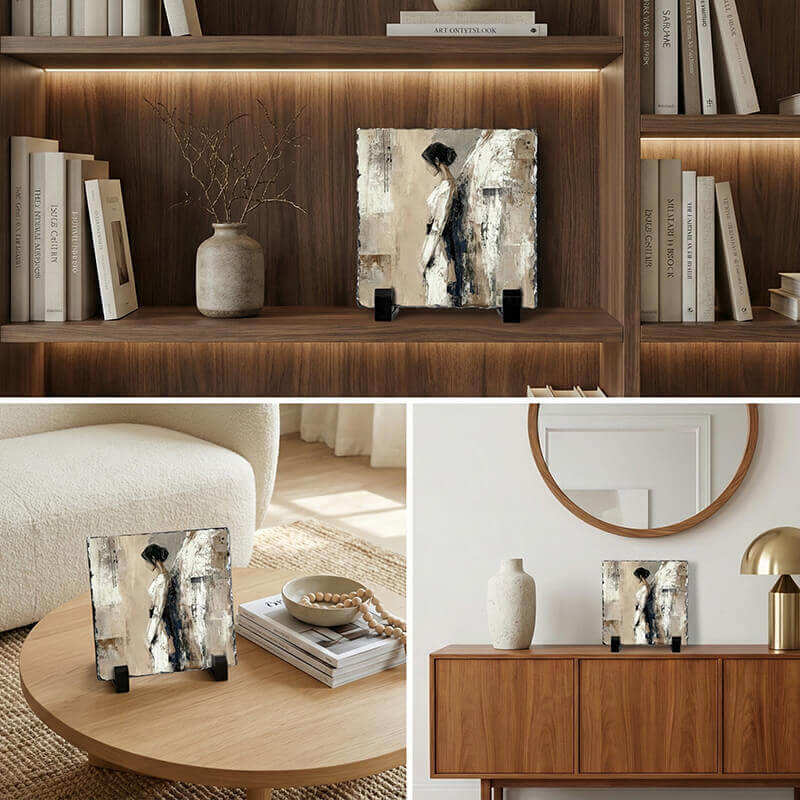 Για εσάς που αναζητάτε κάτι πιο αφαιρετικό και μοντέρνο, αυτός ο Πέτρινος Πίνακας Επιτραπέζιος αποτελεί την ιδανική επιλογή. Το σχέδιο θυμίζει καλλιτεχνικό σκίτσο με μελάνι και πινελιές σε γήινους τόνους, αποτυπώνοντας τη μορφή ενός αγγέλου με έναν ιδιαίτερα εκφραστικό τρόπο. Η εκτύπωση πάνω στον φυσικό σχιστόλιθο ενισχύει τον ρουστίκ χαρακτήρα του, κάνοντάς το να μοιάζει με εύρημα από άλλη εποχή.