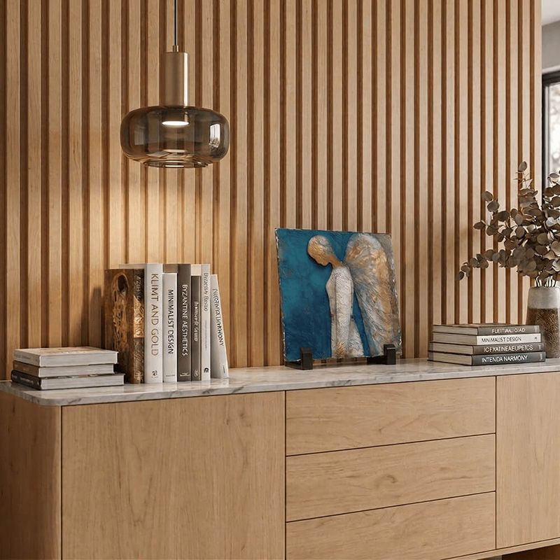 Η αέρινη μορφή του αγγέλου συναντά την τραχιά επιφάνεια του σχιστόλιθου σε μια εντυπωσιακή αφαιρετική σύνθεση. Το βαθύ τυρκουάζ φόντο και οι χρυσές λεπτομέρειες δημιουργούν ένα επιβλητικό έργο που αποπνέει απόλυτη γαλήνη και πνευματικότητα.