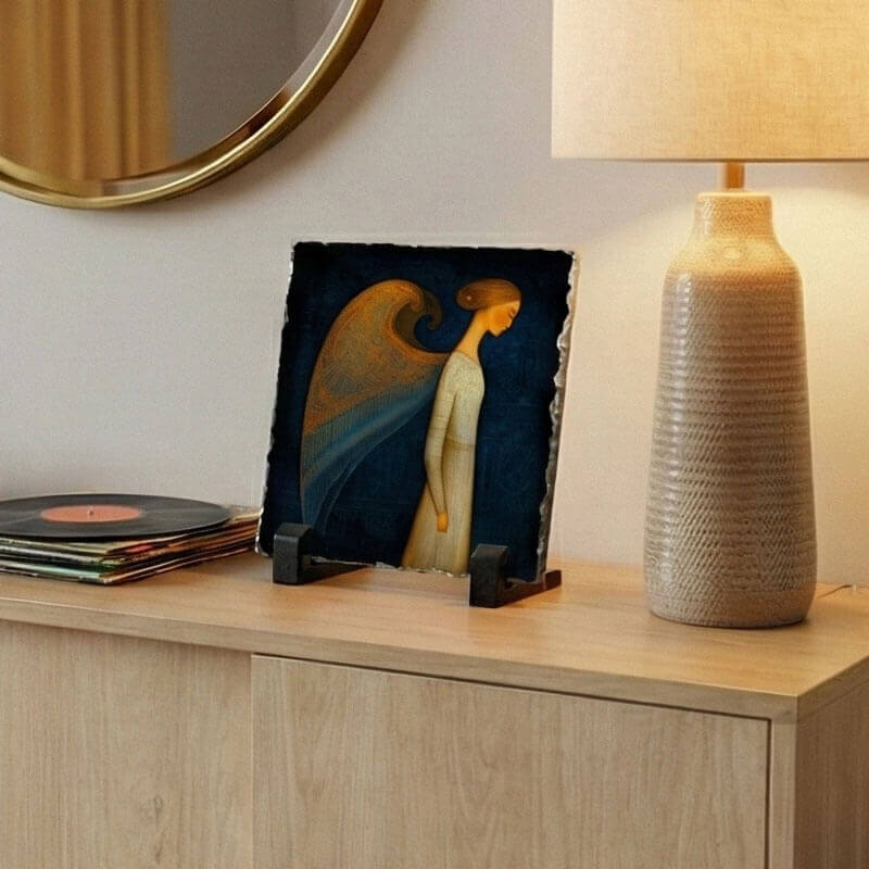 Προσδώστε μια αίσθηση μυσταγωγίας και πολυτέλειας στον χώρο σας με αυτόν τον μοναδικό Πέτρινο Πίνακα Επιτραπέζιο. Η παράσταση εστιάζει στην καθηλωτική αντίθεση ανάμεσα στο βαθύ, σκοτεινό φόντο και τη λάμψη των φτερών που θυμίζουν περίτεχνο χρυσό κέντημα. Το θέμα έχει αποτυπωθεί απευθείας πάνω σε φυσικό πέτρωμα σχιστόλιθου, αναδεικνύοντας τις ακανόνιστες άκρες του που το κάνουν να μοιάζει με αυθεντικό έργο τέχνης από άλλη εποχή.